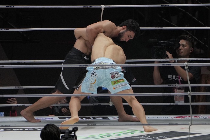 1R、立ち合いからいきなりダブルレッグに入る征矢。右で小手のガジャマトフは受け止めて征矢の崩しに、逆に四つから左で差してテイクダウン! 立つ征矢に離れ際に背後から左の蹴り。