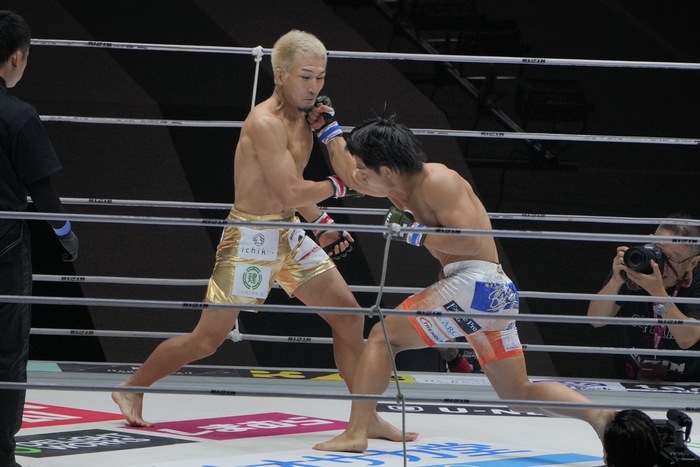 右カーフを当てるヒロヤ。さらに左ミドルを届かせる。ワンツーは遠いが、左ミドルを突くヒロヤ。元谷は左ジャブ。右ローは空ぶり。詰めるヒロヤに元谷は右。そこに右を返すヒロヤ。左を上下に突いてアッパーで入るヒロヤ。右オーバーハンドをかわす元谷は、ノーモーションの右。さらにその場跳びのヒザ蹴り!