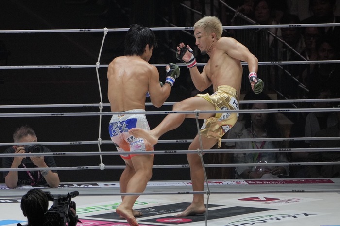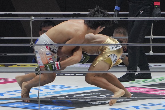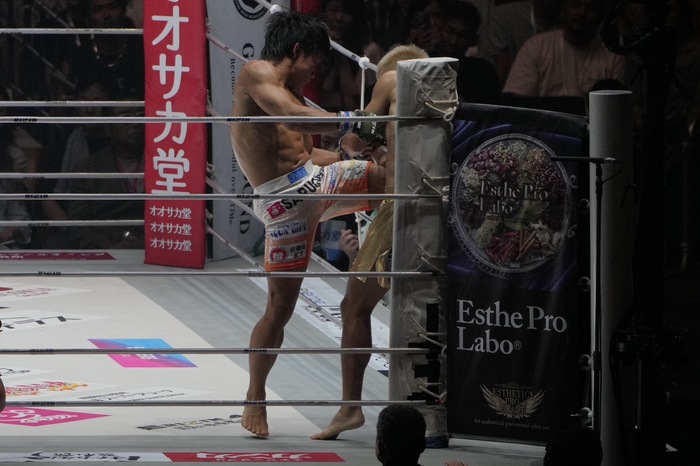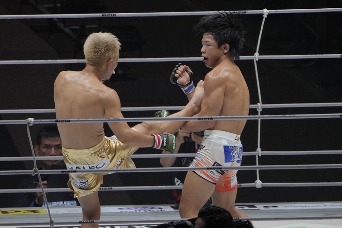 3R、階級落とした元谷にとってスタミナが問われる最終R。ヒロヤにとってはこの後半で盛り返せるか。先に前に出るのは後が無いヒロヤ。左ミドルを当ててコーナーに詰めるが、元谷は左ジャブ、しかし元谷も左右をまとめてヒザ。ヒロヤは左を突いて連打もコーナーで首相撲の元谷! 離れるヒロヤを追って左フック、ダブルレッグへ。