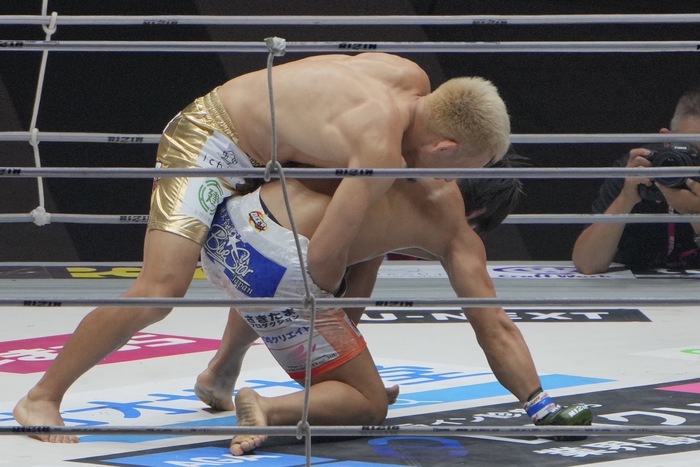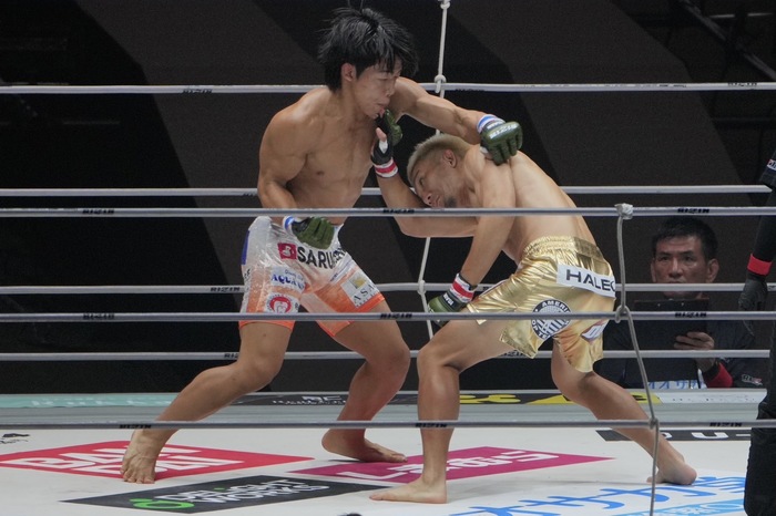 左ジャブの元谷は、前蹴り! 下がらされるヒロヤに右前蹴りから右! ヒロヤの前進をいなして体を入れ替え、シングルレッグ。ここは切るヒロヤはサッカーキックもかわす元谷。ヒロヤは左フックもかわす元谷。コーナー背にする元谷に跳びヒザのヒロヤに、体を入れ替える元谷も右から左のヒザ!