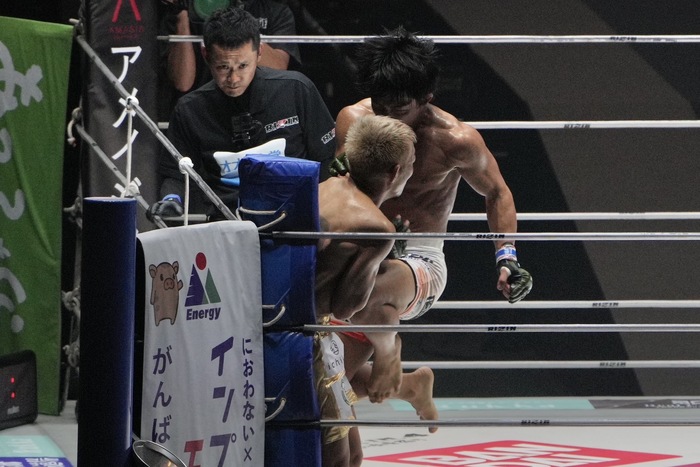 2R、先に詰めるヒロヤは左ハイ。コーナーに詰めて右も、元谷は左右を叩いてテイクダウンの動きで頭の位置を合わせたところにがぶりヒザの元谷! さらに入って左ヒザを突く。