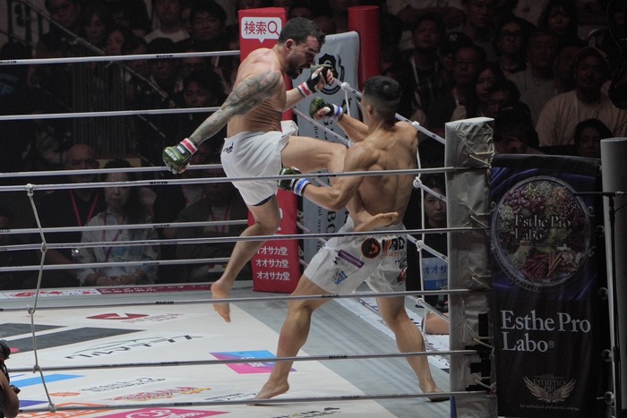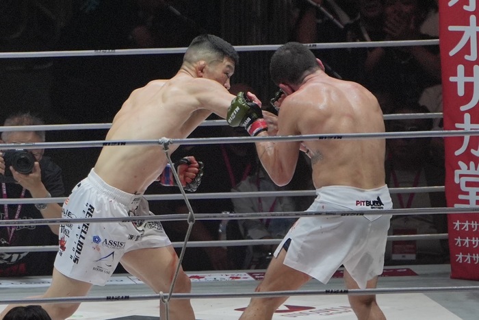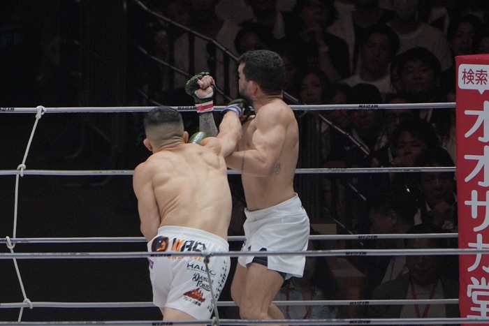 3R、左の前手で突く野村を、さらに右で飛び込むがダックでかわすパトリッキー。野村も右跳びヒザで入るとパトリッキーもワンツーで返す。野村の左の縦拳が当たると、野村は左を当てて右に繋ぐ。