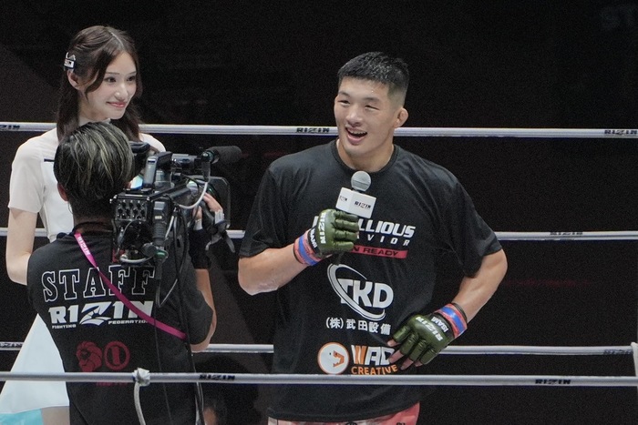 試合後、野村は、「毎日パトリッキー選手のことを考えて、正直、ちょっと怖かったです。もうRIZINに相手いないんじゃないですか」とマイク。