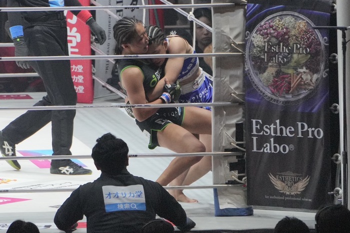 1R、先に右ローからワンツーの須田はコーナーに詰めて小外がけテイクダウンの須田。NOELの立ちに三角絞め! 一度リフトして落としたNOELは右に角度をずらして首もとに足をずらす。須田は腕十字も狙いながら下から鉄槌。正面に戻るNOELは頭を引き付けるが、3分以上を凌ぐNOEL。