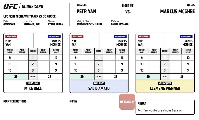#UFCAbuDhabi Official Result: Petr Yan (29-28, 29-28, 29-28 | @PetrYanUFC) defeats Marcus McGhee via Unanimous Decision.