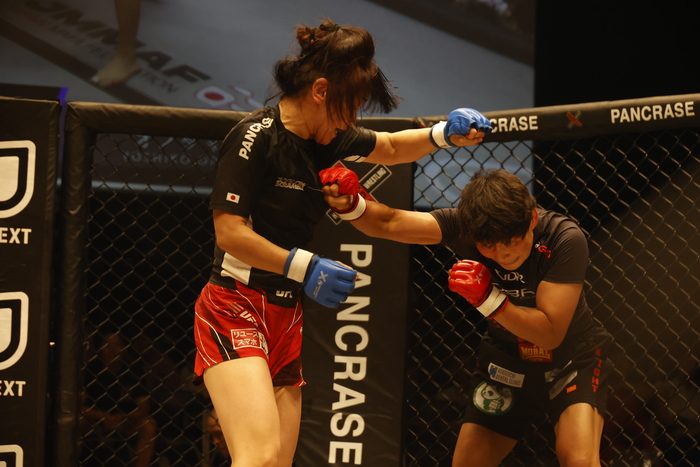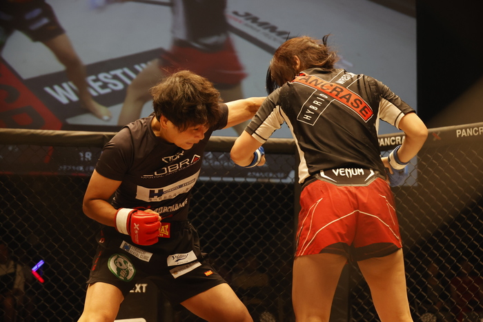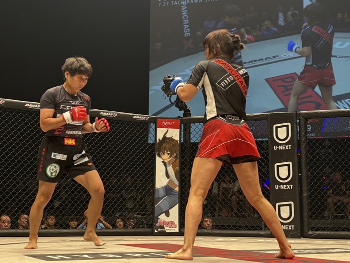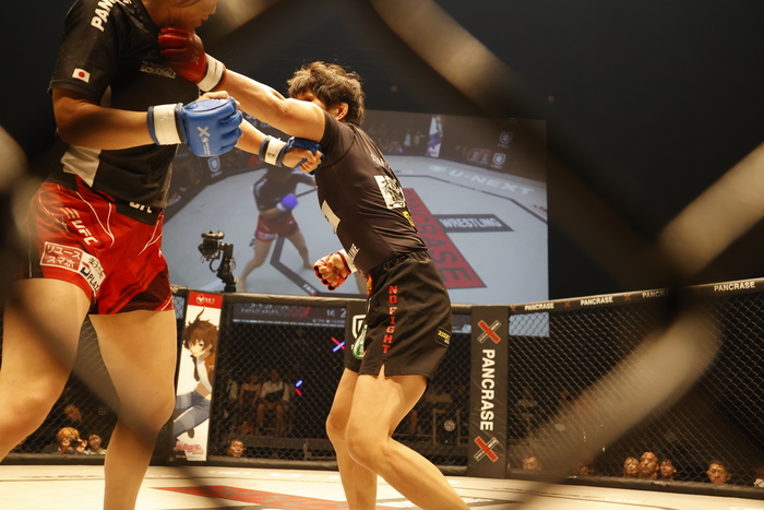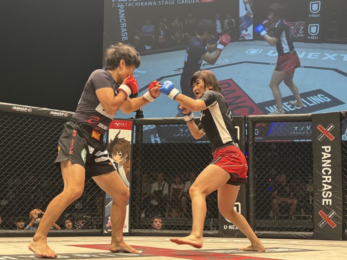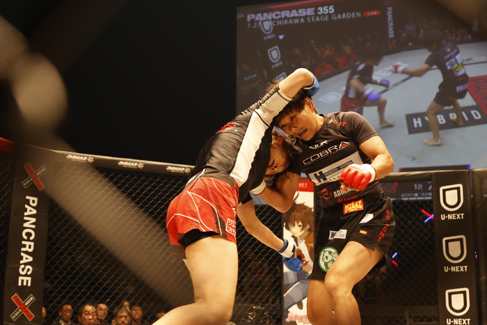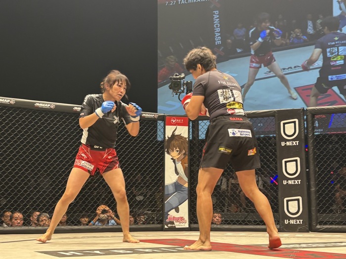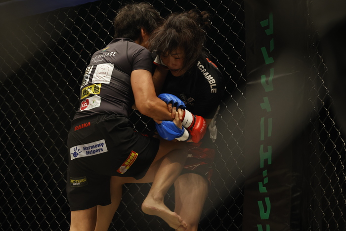 離れるが、すぐにパンチを出しながら詰めるオノダマン。ライカのパンチの距離を潰していく。タックルに入るとスタンドバックの体勢に。バッククリンチのオノダマンにヒジを入れるライカ。1R終了。