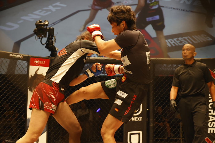 ワンツーを入れるライカにオノダマンも右を返す。ケージに押し込んでいくオノダマンだが、ライカは入れ替えて逆にケージに押し込む。腹にヒザを入れるライカ。