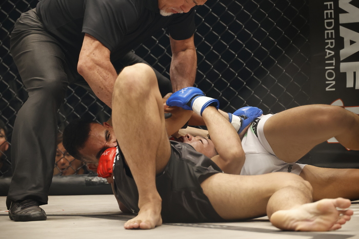 鈴木はここまでの強打と組みで力を使ったか。際を譲って亀になった鈴木に、バルボーザは首を抱えるとアナコンダチョーク! 足を絡ませずに耐えていた鈴木だが、バブボーザの腹のなかで首を曲げられ絞められてタップ!