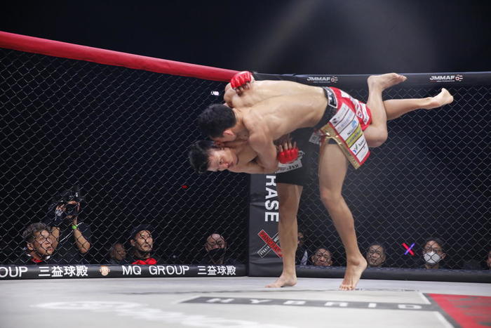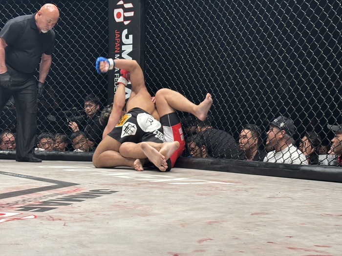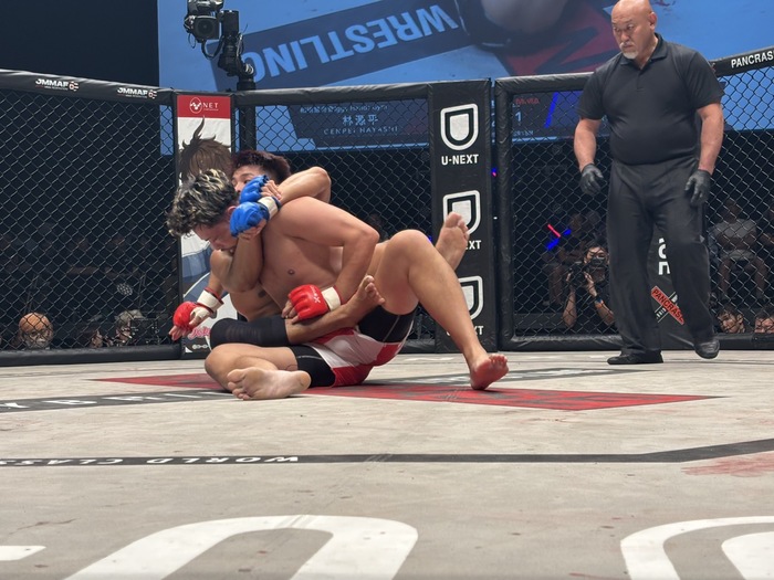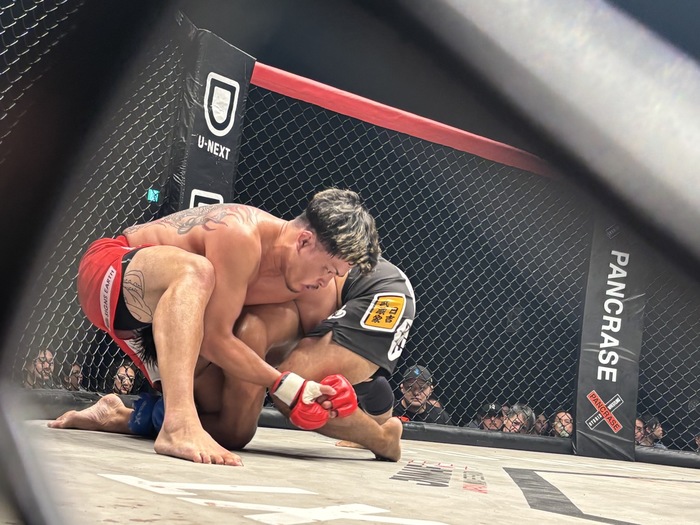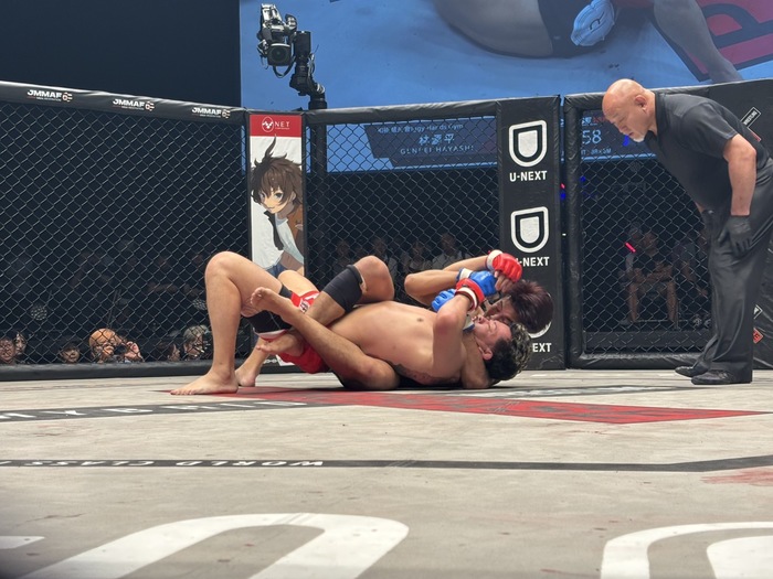 2R、タックルに入った佐藤だが、林は両脇を差して受け止める。佐藤がケージに押し込んでパンチを入れるがブレイク。パンチで出た林。佐藤タックルに入る。こらえる林。佐藤が投げてバックを取った。両足をフックしてバックマウント。体をずらして逃れようとした林だが、佐藤が上をキープしてマウント。パウンドを入れるとまたバックマウントに。向き直りハーフにした林だが佐藤がパウンド・ヒジを落としていく。2R終了。