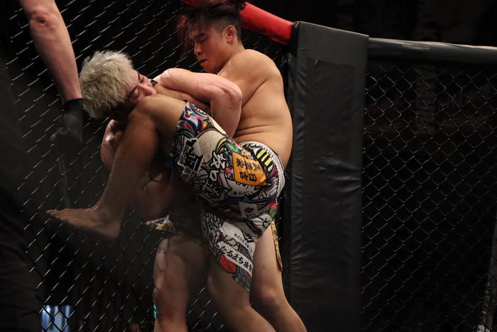3R、間合いを詰める林。ミドルを入れた。組みに来た佐藤の脇を差した林だが、佐藤が閂に捕らえてケージに押し込む。しかし展開がなくレフェリーブレイク。詰めて右を打ち込んだ林。佐藤タックルに。受け止める林だが、佐藤はまたケージに押し込む。