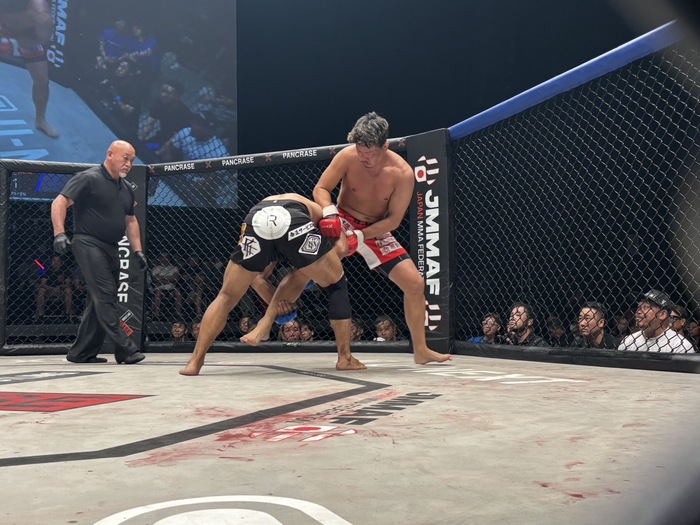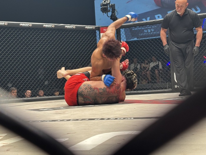 1R、オーソの林に佐藤はサウスポー。佐藤すぐにシングルレッグでテイクダウン。ハーフにするとヒジを落とす。ケージ際で体を起こす林だが、佐藤は寝かせると鉄槌を連打。さらにパウンドを打ち込む。林は足で距離を作り立ち上がる。立ち際に佐藤の頭が当たりバッティングでタイムストップがかかる。再開。佐藤が詰めてタックルへ。ケージに押し込む。ブレイクがかかる。林右ハイ。佐藤の画面にヒット。佐藤タックルに入る。切った林だが、佐藤がケージに押し込む。右を打ち込んで離れた。1R終了。