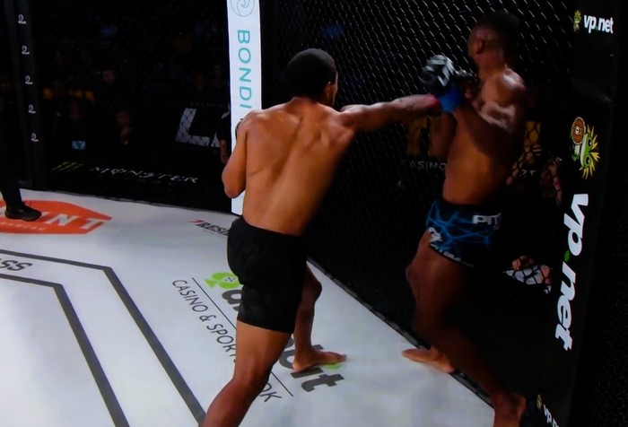 カウンターで打ち抜かれたマヌーフは棒のように膠着してダウン! 腰を掴んでそのダウン際をマットに倒したベイノアはすかさず右の鉄槌連打でレフェリーが間に入った。