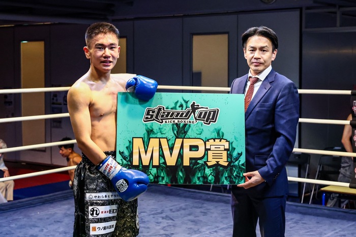 2R、右ストレートをヒットさせてぐらつかせた清水はパンチ連打でダウンを追加。前に出る武田からパンチでこのラウンド2度目のダウンを奪った清水が、追撃のパンチを打ったところでレフェリーがストップした。なお、清水が今大会のMVPを獲得した。