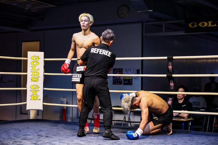 2Rも右のテンカオを当てダウンを奪った佑太郎は、パンチの連打を見舞いKO勝ちした。