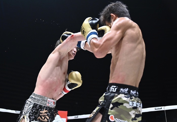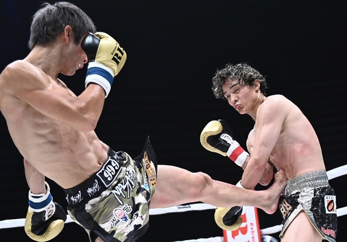 2R、玖村が右カーフからワンツー、志朗は左インローを蹴る。玖村が左ミドル、志朗は前蹴りと右ロー。志朗が飛び込んだところでバッティングとなり、玖村にインターバルが与えられる。右カーフを蹴った玖村は二段飛び蹴り、すぐに志朗が右ストレートを打つ。