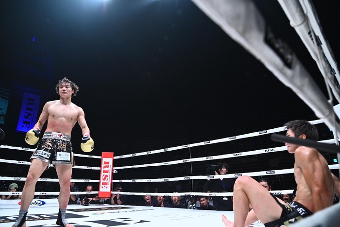 玖村の右にもワンツーを合わせようとする志村。左ボディから左フックの玖村は右カーフも蹴っていく。前へ出る玖村が飛び二段蹴りをヒットさせるが、その直後に志朗がワンツーからの左フックで2度目のダウンを奪った。OPスコアは10-8×3で志朗。