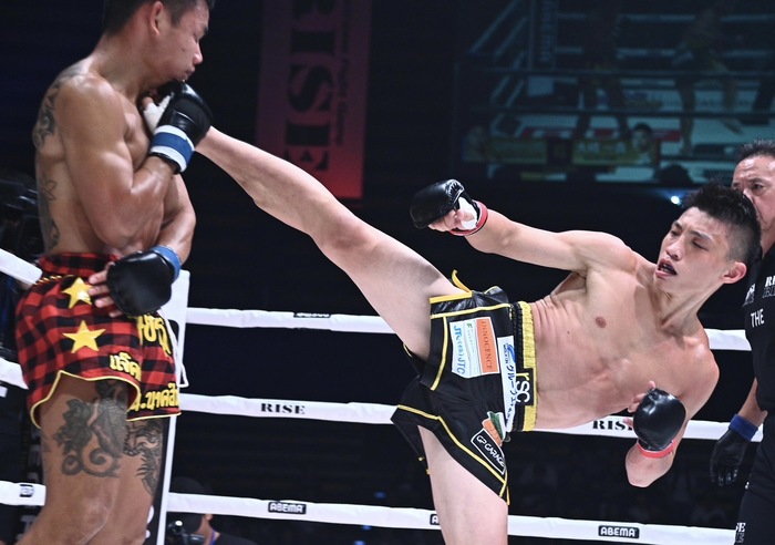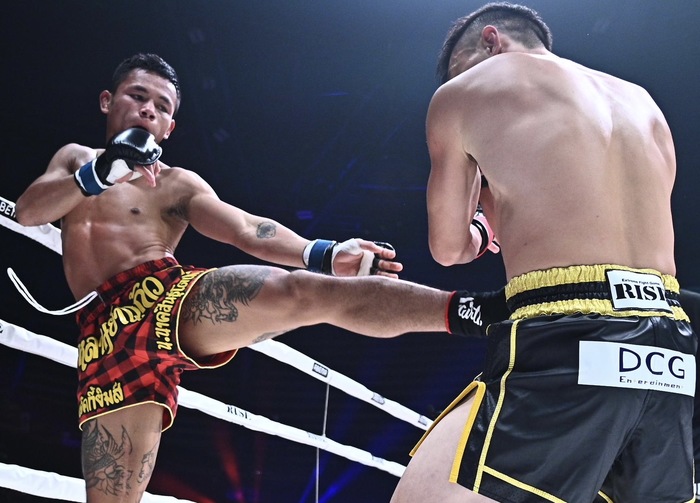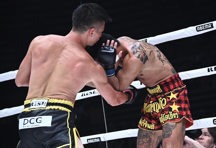 大﨑は左ボディを打ち、左フック、右ストレートにつなげていく。コーナーへ詰めて左ボディ、ヒザ、左フックとまとめる大﨑。コーナーから逃さず左ボディを中心に打ち続ける。さらに右カーフ。ラニャゲーオも打ち返し、左ミドルを蹴るが大﨑の左右ボディに身体を丸める。大﨑の左ヒザで完全に身体を丸めてしまいダウン。残り14秒、大﨑はバックキックから左ボディ、左フックと仕留めに行ったが1R終了。