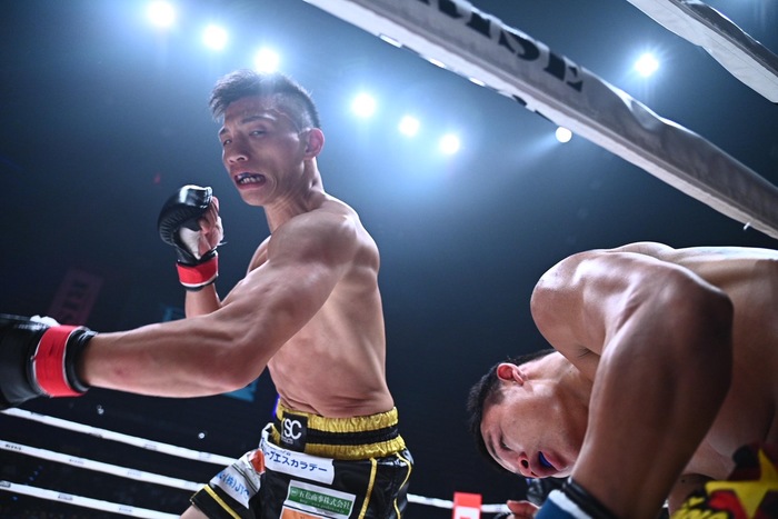 3R、ラニャゲーオはロープを背負っての左ミドル連打。サウスポーからの左インローがローブローとなってしまい、大﨑にインターバルが与えられる。左ミドルを蹴って下がるラニャゲーオに大﨑は右フック。圧をかけて追い詰め左右フックと左右ボディを見舞う大﨑にラニャゲーオはクリンチを多用。注意を受ける。ヒザで対抗するラニャゲーオに大﨑は左フック。飛びヒザ蹴りの応酬。大﨑の右ボディストレートに身体を丸めるラニャゲーオへ大﨑はボディ攻め。ロープを背負ったラニャゲーオに左ボディを連打してスタンディングダウンを追加。すぐに詰めて大﨑が左右ボディを連打したところで、ラニャゲーオが身体を丸めてしまいレフェリーがストップ。大﨑のTKO勝ちとなった。