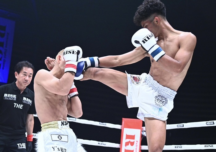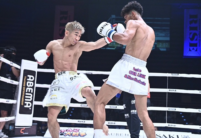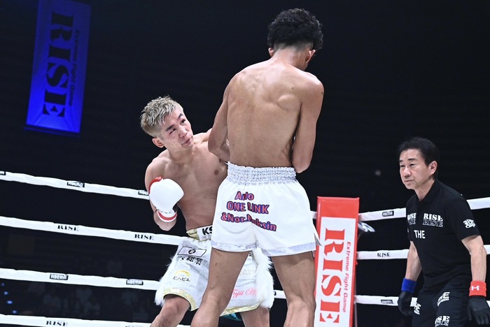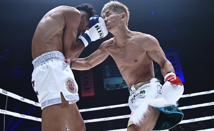 1R、いきなり右ハイを蹴る良星にオート―も左ハイを蹴り返す。右カーフを蹴れば右カーフを蹴り返すオート―。軽快なステップを踏む良星は左右に動き、飛び込んでの左フック、左ボディ、右カーフ。スピードのある出入りでパンチをまとめ、ヒザやインローにつなぐ良星。どんどん距離を詰めてオート―にロープを背負わせる。