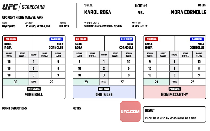 #UFCVegas108 Official Result: Karol Rosa (30-27, 29-27, 29-27 | @karolrosaufc) defeats Nora Cornolle by unanimous decision