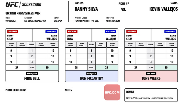 #UFCVegas108 Official Result: Kevin Vallejos (30-27, 29-28, 30-27 | @elchinovallejos) defeats Danny Silva by unanimous decision