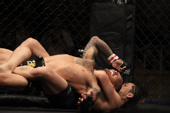 2R、嵐士のダブルレッグをがぶる中山。スイッチで立つ嵐士は再び組みに。切って左を振る中山はボディロックテイクダウン。疲弊する嵐士を詰める。本戦判定はドロー。