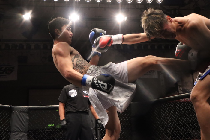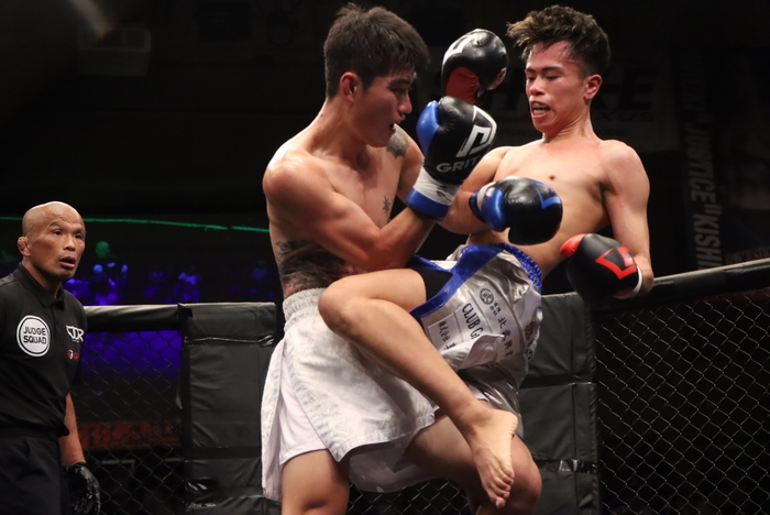 オーソから左の蹴りの清島に、マ・シンフは右前蹴りから入り、左ボディ右フックとケージまでパワフルに詰めてクリンチ。2Rにマ・シンフのバッティング。清島インターバルから再開。左ボディ、左の蹴りの間合いの清島にマ・シンフは詰めて左右。