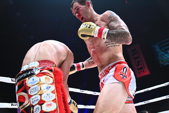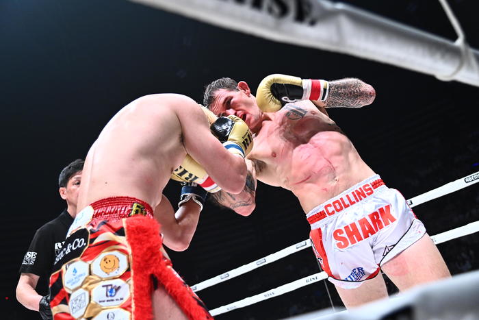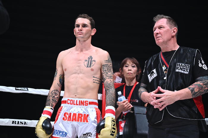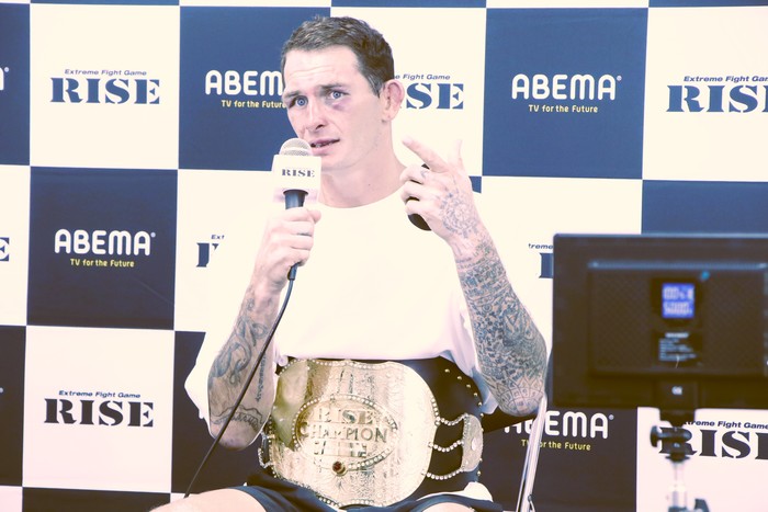 セミファイナル(第11試合)のRISE世界スーパーライト級タイトルマッチ3分5R無制限延長Rで、挑戦者・原口健飛(FASCINATE FIGHT TEAM)に1Rでダウンを奪われながらも、猛烈な追い上げで判定2-1の逆転勝利を収めた王者チャド・コリンズ(オーストラリア/Stirkeforce)が試合後インタビューに答えた。