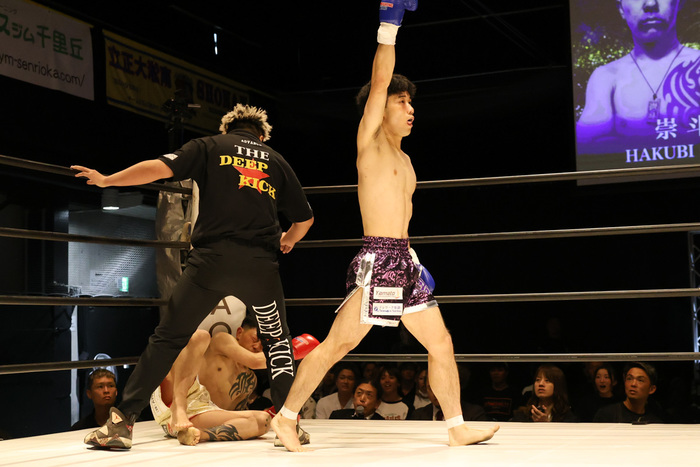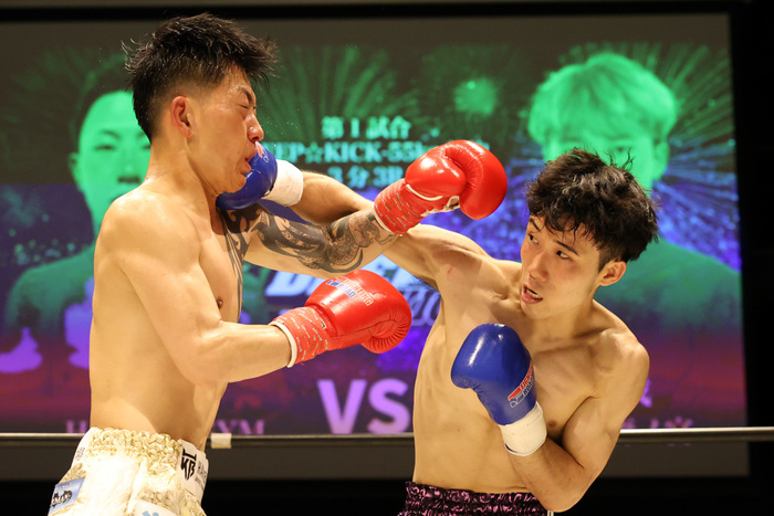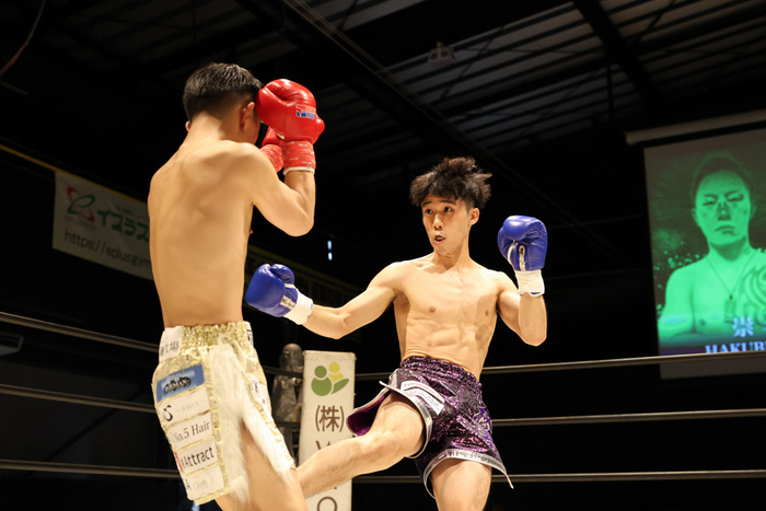 「香川県から全国に名が轟くようなファイター」を目指す崇斗と5月のプロデビュー戦では敗戦と次こそはプロ初勝利を狙う西垣の1戦は1R、互いにカーフを放つなかでワンツーを軸に崇斗が圧を強めていく。西垣は下がらされる展開が続いていき崇斗が攻勢を見せていく最中、西垣の左フックがヒットすると崇斗はたたらを踏んで下がっていき西垣の追撃によりダウン。立ち上がるもダメージが見える崇斗、西垣は倒しきりたい所だったがラウンド終盤という事もあり崇斗がゴングに救われた形となり第1ラウンド終了。
