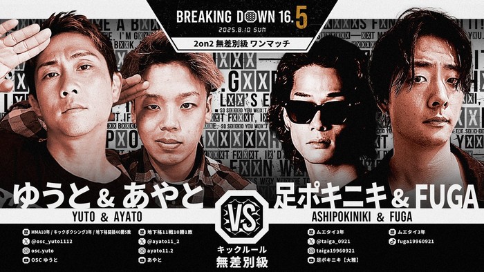 2vs.2で行われる2on2(4選手が同時に戦う)が久しぶりに行われる。足ポキニキとFUGAの双子の兄弟と、ゆうととあやとの親子が対戦する。足ポキニキとFUGAはアマチュアムエタイで活躍、ゆうとは『BreakingDown 12』に出場して前田島純に勝利し、あやとは『BreakingDown 15』でなおきに敗れた。