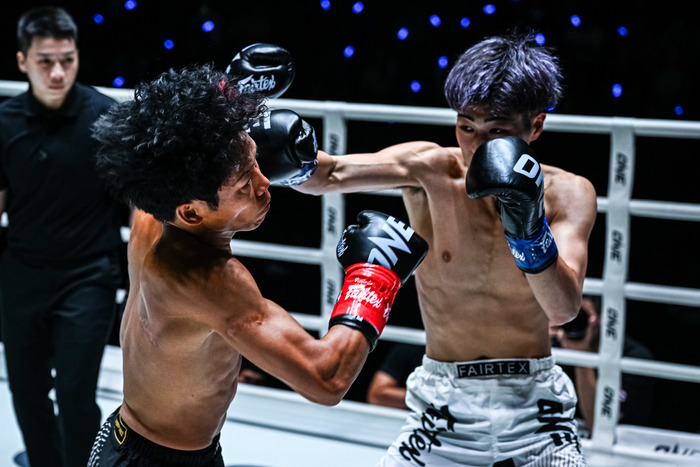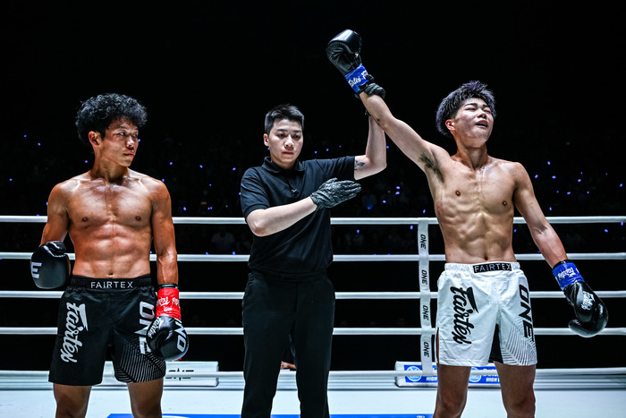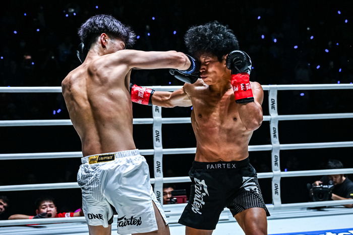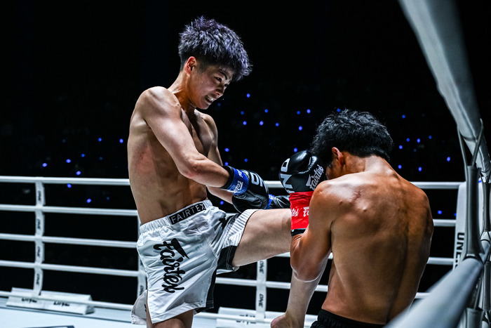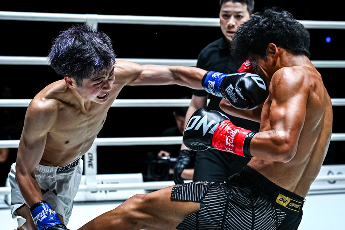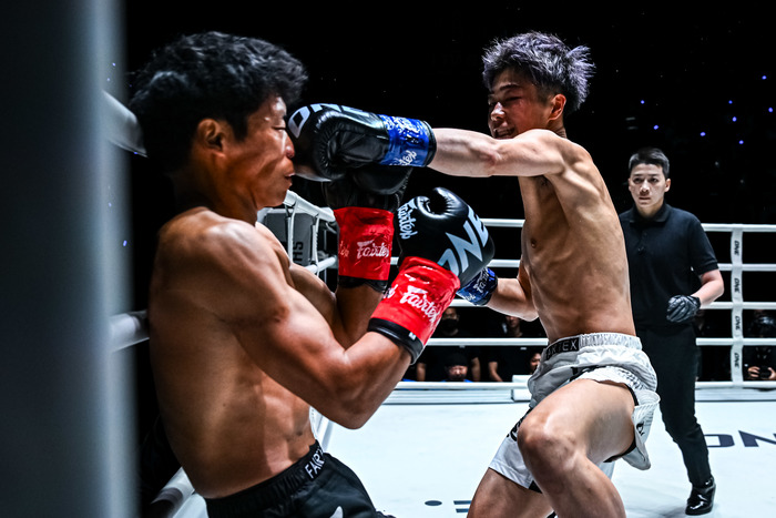 1R、サウスポー同士。チェンハオは左ミドルと左カーフ、水野は長いジャブを打ち、右へ回り込んで右インロー。右側にポジションをとってワンツーを打ち、飛びヒザ蹴りを放ってヒットを奪う。左ローからワンツーの水野。チェンハオは前へ出ていくが、そこへ水野がボディへのワンツー。