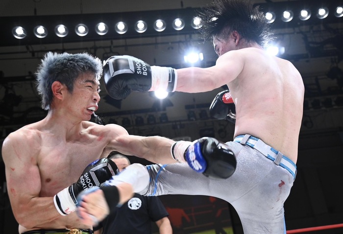 しかし、本戦はドロー。延長戦へ。ここで小林が首投げを狙ったが竹野は防ぐ。竹野の右がヒットして小林は鼻血。勢いづいて左フックを放つ竹野に小林は左ストレートを狙う。竹野の右と小林の左が交錯するが、コーナーを背負う小林の印象が悪いか。竹野の左フックヒットが目立ち、小林の顔は鼻血で真っ赤に。ドクターチェックが入る。再開後、互いにミドルを蹴ってパンチにつなぐ。