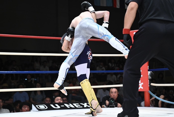 3R、連打で前へ出る小林に竹野は首投げ。ワンツーの小林に竹野は組んで投げを狙い続ける。左ミドルから左ストレートでボディを攻める小林に竹野は身体を丸める。小林はフロントチョークに行くがこれは決まらず。パンチで攻める小林に竹野は投げを狙い続け、試合終了直前に大外刈りでシュートポイント(1点)を追加。