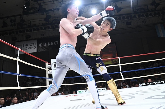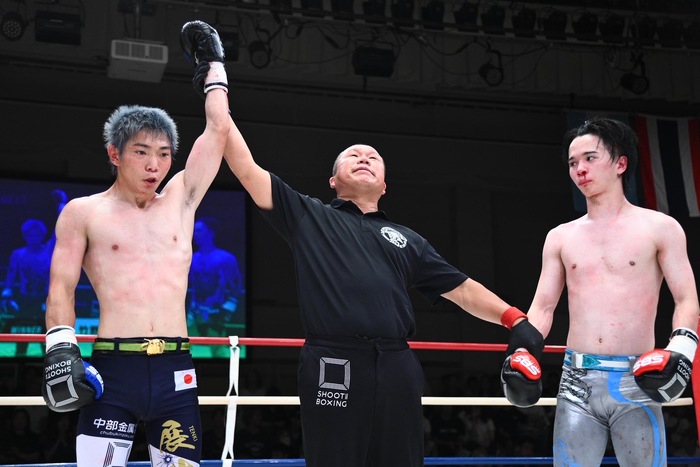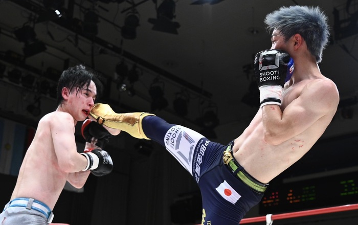 2R、竹野の左フックからの右ミドルに左フックを返す小林。竹野は小林のパンチをよく見て左フックからの連打を当てる。右ボディ、ヒザの竹野に小林は左ミドル。竹野も右ミドルを蹴り返す。竹野は小林の左ミドルをキャッチすると反転するようにして投げてシュートポイント(1点)。逆転を狙ってパンチで前へ出た小林だが、竹野を捉え切れず。