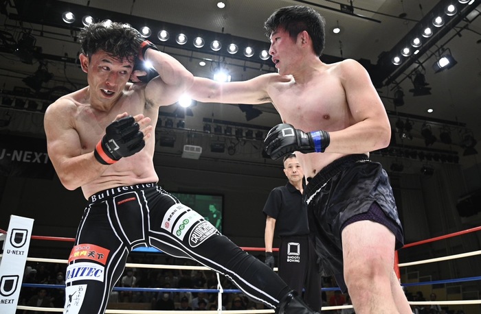 1R、右ローと左ミドルの佐々木に金子が左フックをヒット。サウスポーになって左ミドルを蹴る佐々木はオーソドックスに戻ると右カーフ。金子はクリンチアッパーを連打、離れると右ボディ。蹴りの佐々木に左右フックを当てる金子。佐々木は右ストレート、左フック、金子も左フックを返す。