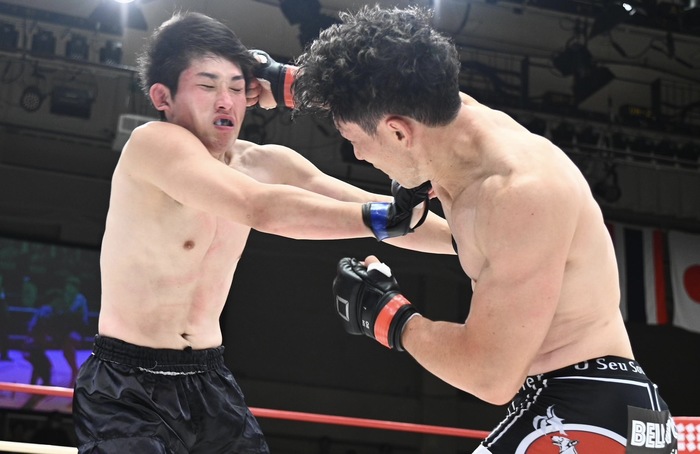 2R、クリンチしてのアッパー&フックを連打する金子は、左ミドルを蹴る佐々木に右フック。左ミドルからの右ストレートで前へ出る佐々木。左ハイからの右ストレートもヒット。金子はクリンチアッパー。
