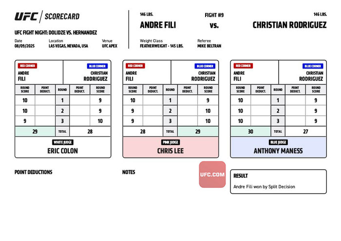 #UFCVegas109 Official Result: Andre Fili (29-28, 28-29, 30-27 | @TouchyFili) defeats Christian Rodriguez by Split Decision pic.twitter.com/i89xbYH8hX