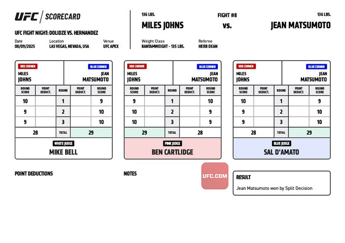 Split scorecards are scored for this fight! 📝@JeMatsumotoUFC wins this split decision at #UFCVegas109!