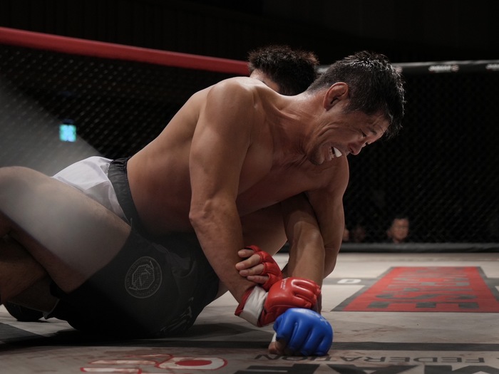 左ジャブ、右ローの加藤。小野は右カーフ。加藤はシングルレッグ。そこに小野はスタンドのギロチンチョーク。足が浮く加藤を引き込んでクローズドガードに入れて絞める小野だが、中腰で凌いで首を抜いた加藤が上に。細かいパウンド。小野の長い足が解除されると加藤はパウンド。そこに小野は腕十字、三角絞め狙いから下からヒジを突く。3者10-9で小野。