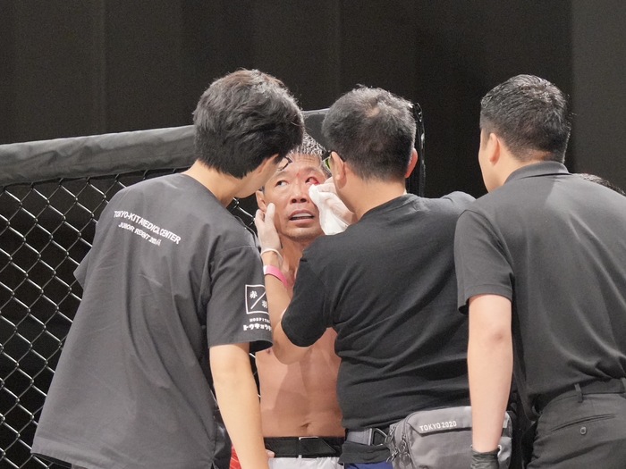 3R、先に前に出る小野は加藤の組みに右ヒザ。加藤のテープが剥がれ、修正し再開。左ジャブを突き、加藤の組みを切る小野。加藤は左目から出血。ドクターチェック。有効打によるカットでドクターストップ。小野がTKO勝ち。