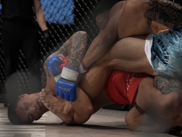 2R、ボディロックテイクダウンの平澤。足をかけさせない小宮にシングルバックへ。しかし横に落とした小宮がトップに。下の平澤はラバーガードから左腕を越えて三角絞めに。徐々に角度をずらして極めた。