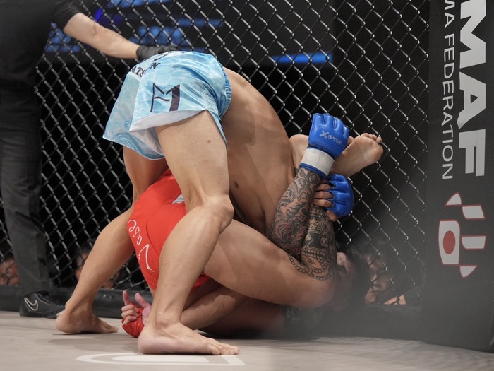 1R、小宮がシングルレッグも、平澤は跳び付きギロチンチョーク。ケージに頭を押し付けて首を抜いた小宮。下に落ちながら平澤はオモプラッタ狙い。左ヒザをニーオンでピンする小宮に、平澤は下から足関節。トーホールド、ヒザ十字狙いも座ってバック狙いの小宮。左ヒザを抜くと、今度は右足を狙う平澤。足を外してトップに移行。