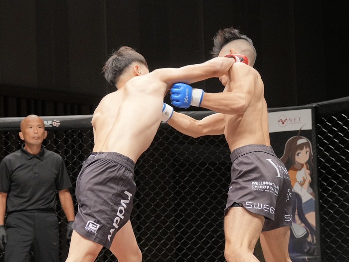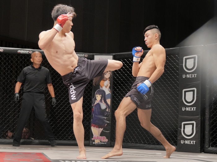1R、ともにオーソドックス構え。左ハイ、右ストレートを突く田口に、矢野は前蹴りから躊躇なく引き込み。下から足をすくいに。立つ田口に草刈り。そこから逃れる田口のバックに。