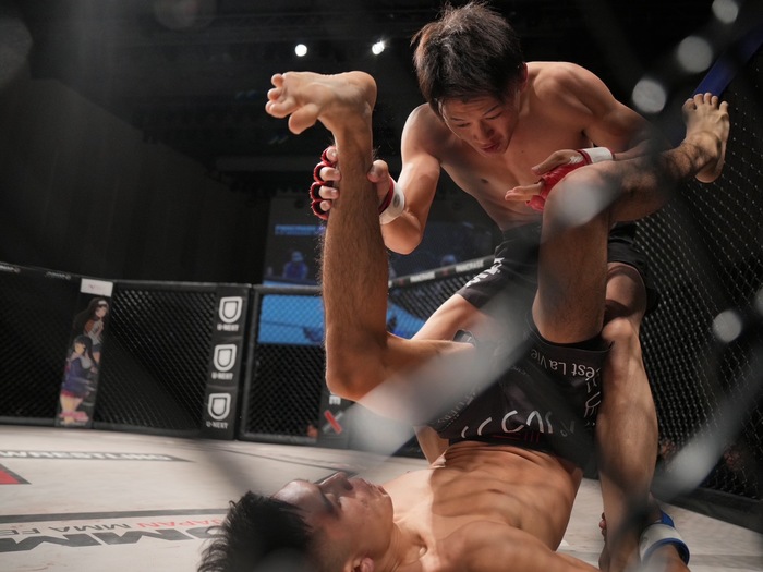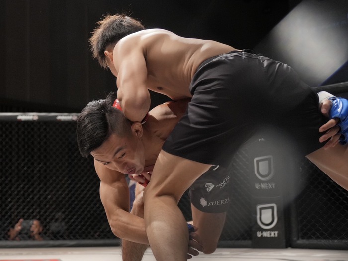 左で差して上を取りに来た田口に右で腕を巻き込み三角を組んで下に。またいでずらそうとした田口にヒザ裏で組んでマウントに。ケージを蹴って返そうとする田口に、矢野は最後はうつ伏せになって腕ひしぎ三角固めを極めてタップを奪った。