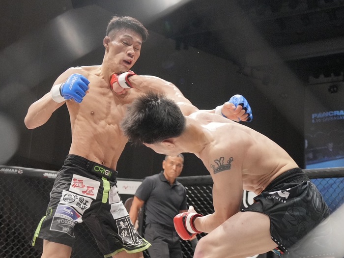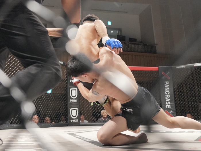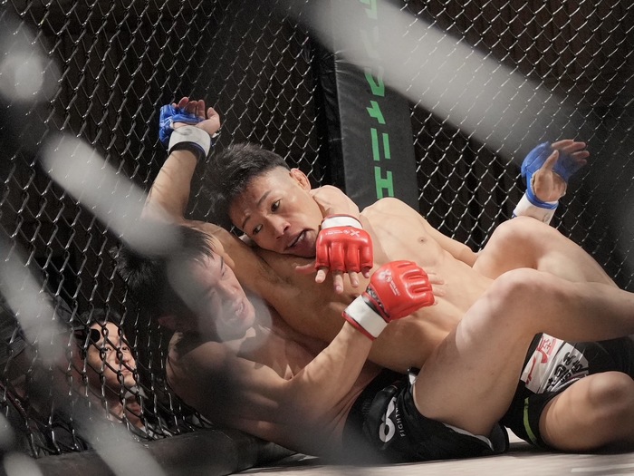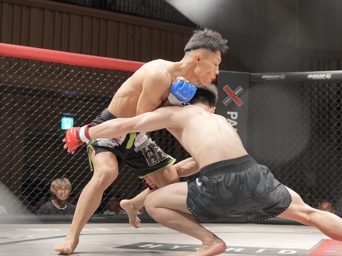 2R、右を当てて前に出る福里がバッククリンチも胸を合わせる清水。右カーフの福里に清水は右アッパーを狙う。