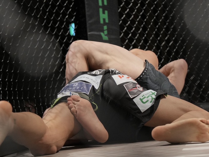 互いに死力を尽くすなか、左ジャブを当てる福里。右カーフ。右から左の。清水はここで前に出るが、福里は残り15秒でダブルレッグテイクダウン! パスしてパウンドでホーン。