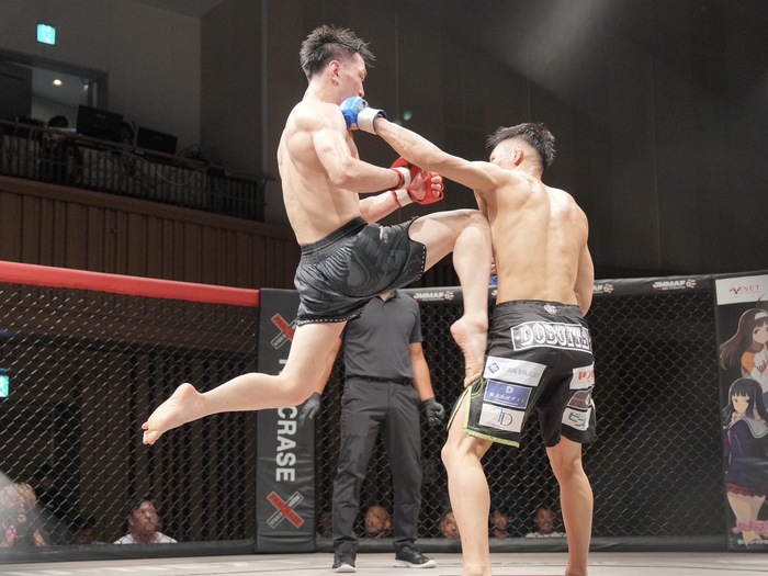 跳びヒザの福里。左をヒット。清水も前に出て右から左も、体を入れ替えた福里は左ボディストレート。その入りに右を突く清水。左の蹴り終わりに詰めた福里。