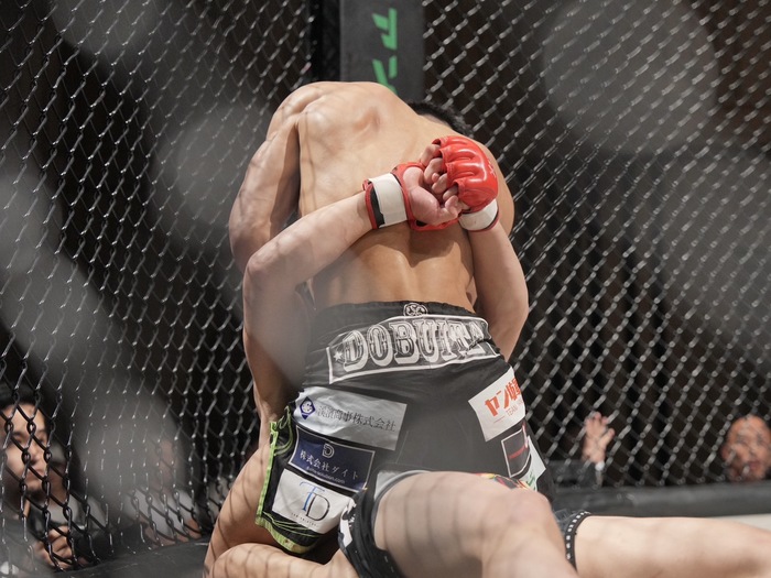3R、右カーフの福里。ワンツーで前に出る清水は起死回生の左をヒット! 腰から前のめりに崩れながら清水の腰にしがみつく福里! マウントパウンドの清水に福里は亀から立ち上がり。清水も疲労の色濃い。