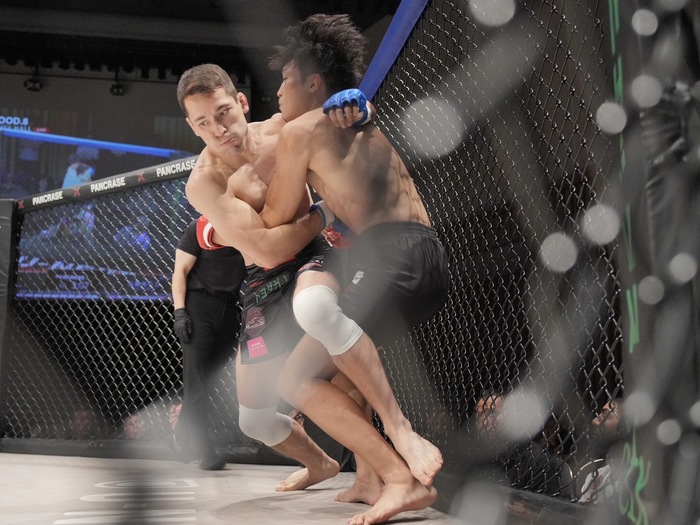 1R、グローブタッチ無し。遠間に立つオーソの木村。詰めるサウスポー構えの佐藤は左を伸ばして組んで右でオーバーフック。ギロチンチョークを狙いながらも着地。
