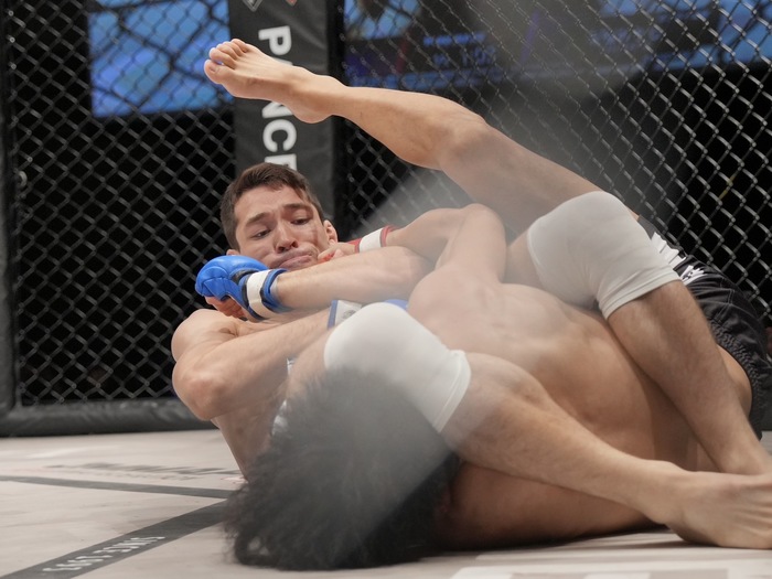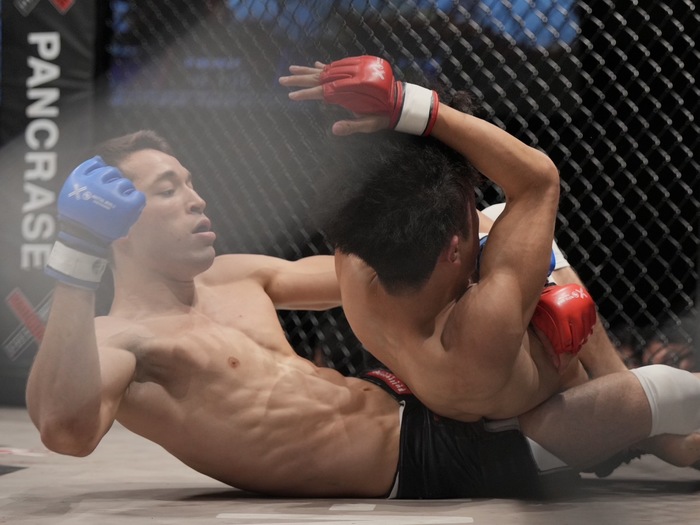体を入れ替えた佐藤は右で差して左ヒジ。引き手と首を抱え首投げテイクダウン! 亀になる木村にボディトライアングルに。脇を潜ろうとする木村におたつロックの佐藤。